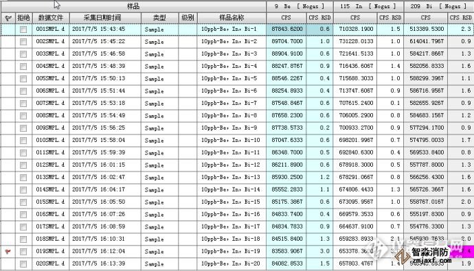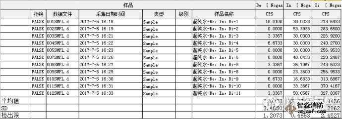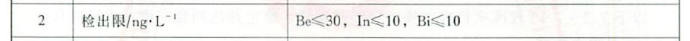 以18M Ω.cm的超純水進樣,測量測量質量數9,115,209處的離子計數,積分時間0.1s,分別測量11個數據,用測量結果的標準偏差SA的3倍除以Be、In、Bi的寧明的S,結果即為各元素的檢出限,CL=3SA/S。