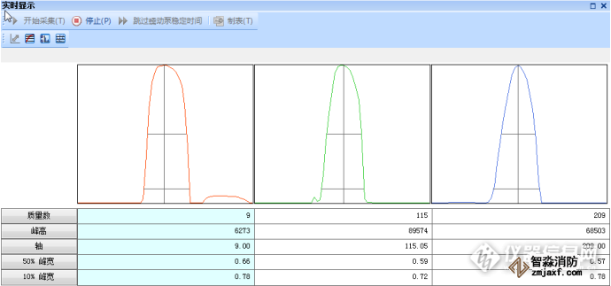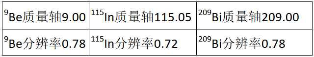 分辨率:以1×10-2 mg/L Be、In、Bi、混合溶液進樣,打印質量數9,115,209的譜圖,并計算10%峰高處的峰寬度。