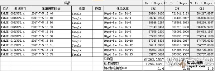 實測指標RSD:Be =1.6%,In =1.9%,Bi= 1.3%