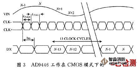 AD9446芯片的控制時(shí)序與傳統(tǒng)的低速A/D有所不同,它完全依靠時(shí)鐘來(lái)控制其采樣、轉(zhuǎn)換和數(shù)據(jù)輸出。AD9446通常在CLK第一個(gè)時(shí)鐘的上升沿開始采樣轉(zhuǎn)換,并在經(jīng)過延遲tpd后,開始輸出數(shù)據(jù)。而數(shù)據(jù)則在第13個(gè)時(shí)鐘到來(lái)時(shí)才出現(xiàn)在D15~D0端口上。圖3是AD9446工作在CMOS模式下的時(shí)序圖。