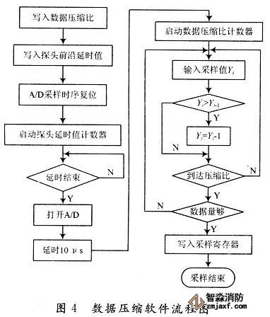 數(shù)據(jù)壓縮處理是對(duì)射頻信號(hào)高速采樣后進(jìn)行前置處理的重要環(huán)節(jié)之一,需要在保持超聲回波信號(hào)基本特征前提下對(duì)采樣數(shù)據(jù)進(jìn)行在線壓縮,而且要求壓縮后的數(shù)據(jù)與原始采樣信號(hào)的包絡(luò)相吻合。為此,在每次壓縮過程中,只取采樣所得的最大值,而舍棄其他采樣值。FPGA將計(jì)算所得采樣數(shù)據(jù)的壓縮比、探頭前沿延時(shí)計(jì)數(shù)值等數(shù)據(jù)送入相應(yīng)的鎖存器,然后發(fā)出時(shí)序復(fù)位命令并發(fā)射,啟動(dòng)探頭延時(shí)計(jì)數(shù),延時(shí)到后啟動(dòng)A/D采樣,同時(shí)壓縮比計(jì)數(shù)器開始計(jì)數(shù),在時(shí)鐘信號(hào)的控制下,每采樣一次,壓縮比計(jì)數(shù)器減1,并將當(dāng)前采樣值與前次采樣值比較,如大于則保存,否則舍棄,直至壓縮比計(jì)數(shù)到零后,得到一個(gè)有效的采樣數(shù)據(jù)。同時(shí)壓縮比計(jì)數(shù)器自動(dòng)復(fù)位,重新開始計(jì)數(shù),其工作流程如圖4所示。