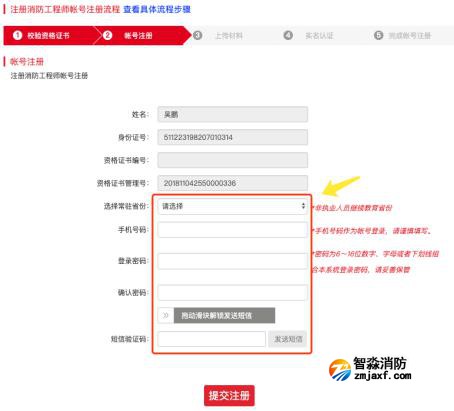 第五步:選擇常駐省份,先填寫手機號碼,拖動滑塊解鎖短信發送,點擊發送短信,填寫驗證碼和賬號密碼后進行提交;