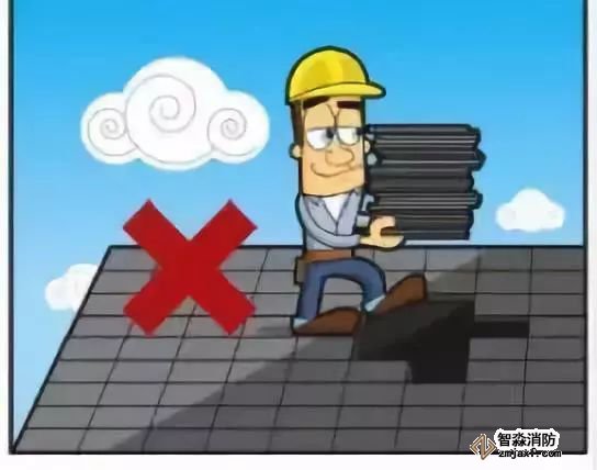 提醒:作業(yè)開始前,工人要檢查作業(yè)環(huán)境是否安全,在輕型屋頂和不牢固的搭建物上作業(yè)時(shí),必須采取可靠的防護(hù)措施。在石棉瓦、玻璃纖維瓦等輕型屋面上作業(yè)時(shí),必須搭設(shè)墊板供施工作業(yè)使用或行走,墊板下方還應(yīng)搭設(shè)安全網(wǎng)。