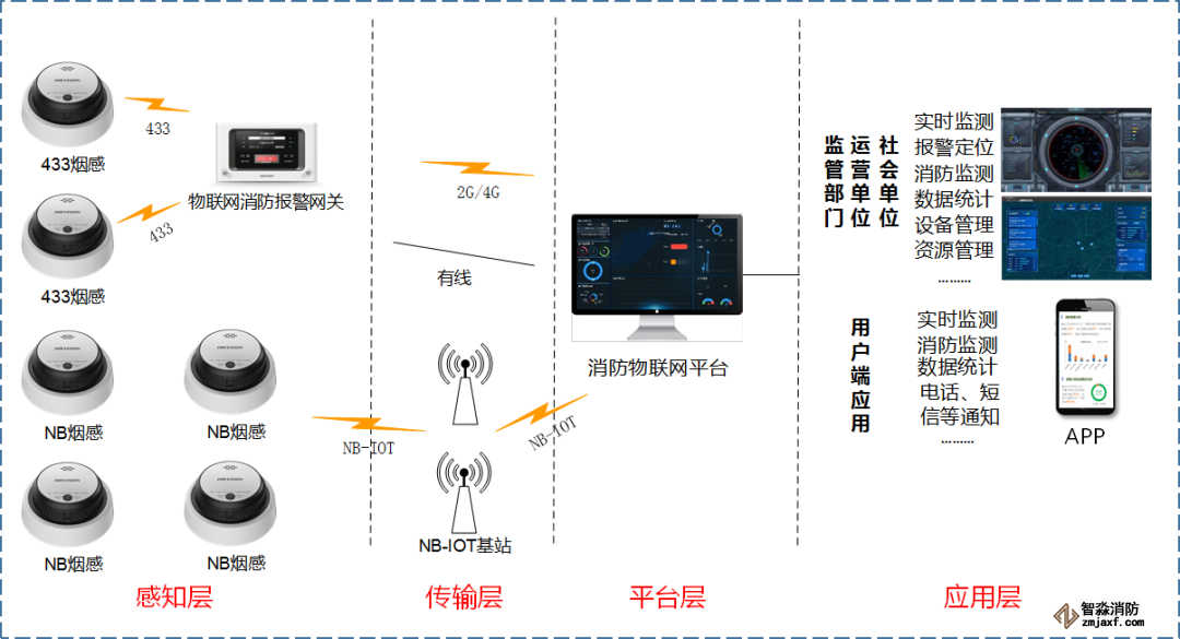 升級版火災(zāi)探測報警器分兩種通訊方式——NB-IoT和433MHz,NB-IoT煙感直接通過運營商NB基站實現(xiàn)信號與報警傳輸至中心平臺,適用于安裝環(huán)境比較分散的場景如九小場所、出租屋、高層住宅;433MHz煙感需要搭配物聯(lián)網(wǎng)消防報警網(wǎng)關(guān)使用,支持有線LAN或無線2G/4G傳輸,適用于安裝環(huán)境比較集中的場景如宿舍。