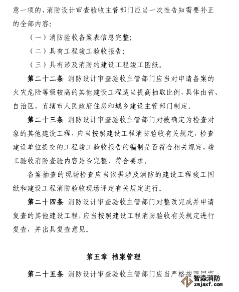 縣級以上地方人民政府住房和城鄉(xiāng)建設(shè)主管部門(以下簡稱消防設(shè)計審查驗收主管部門)依職責承擔本行政區(qū)域內(nèi)建設(shè)工程的消防設(shè)計審查、消防驗收、備案和抽查工作。