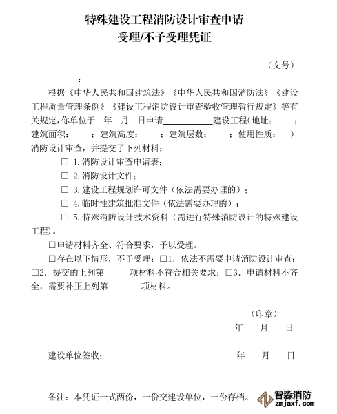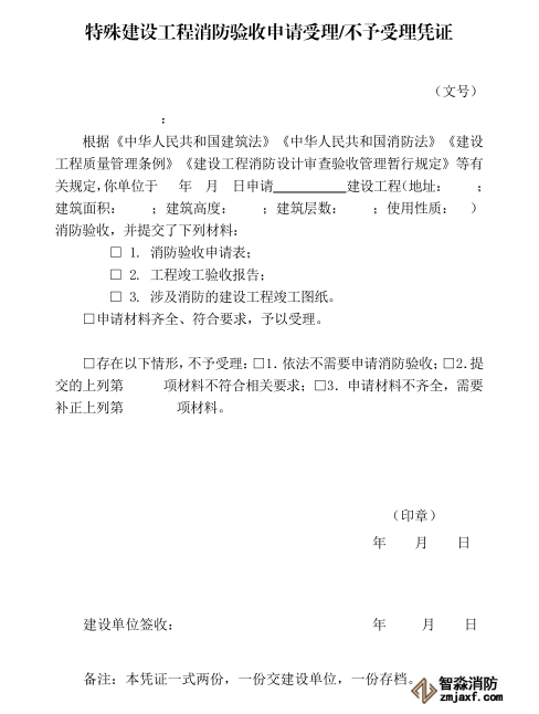 消防設(shè)計審查驗收主管部門收到建設(shè)單位提交的消防驗收申請后,對申請材料齊全的,應(yīng)當出具受理憑證;申請材料不齊全的,應(yīng)當一次性告知需要補正的全部內(nèi)容。