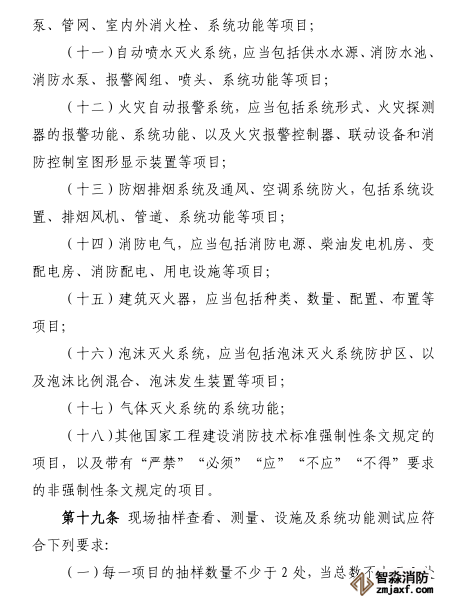 第二十九條 消防設(shè)計審查驗收主管部門受理消防驗收申請后,應(yīng)當按照國家有關(guān)規(guī)定,對特殊建設(shè)工程進行現(xiàn)場評定。現(xiàn)場評定包括對建筑物防(滅)火設(shè)施的外觀進行現(xiàn)場抽樣查看;通過專業(yè)儀器設(shè)備對涉及距離、高度、寬度、長度、面積、厚度等可測量的指標進行現(xiàn)場抽樣測量;對消防設(shè)施的功能進行抽樣測試、聯(lián)調(diào)聯(lián)試消防設(shè)施的系統(tǒng)功能等內(nèi)容。