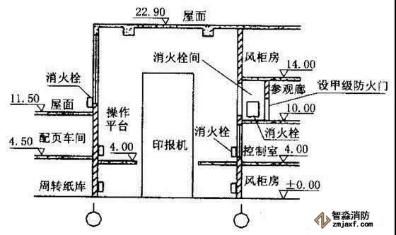 對(duì)于儲(chǔ)備紙庫(kù),以消防員站在0.00m標(biāo)高地面上,按式(1)計(jì)算,水槍充實(shí)水柱應(yīng)在16.7~20.5m之間。故向建筑專業(yè)提出要求,在紙庫(kù)內(nèi)墻10.00m標(biāo)高處增加一圈馬道,在馬道設(shè)置消火栓,以減少充實(shí)水柱長(zhǎng)度,見圖1。印報(bào)機(jī)廠房在0.00m標(biāo)高和4.00m標(biāo)高各有一個(gè)工作平臺(tái)。以消防員站在4.00m標(biāo)高平臺(tái),按式(1)計(jì)算,水槍充實(shí)水柱應(yīng)在20.6~25.2m之間。故考慮在廠房北邊11.50m標(biāo)高屋面上設(shè)置消火栓,通過廠房高大的窗戶向室內(nèi)噴水。在廠房南邊10.00m標(biāo)高的參觀廊(屬于另一防火分區(qū))設(shè)專門的消防栓小間,供消防員使用,消火栓小間用甲級(jí)防火門與參觀廊隔開,見圖2。按圖2設(shè)置消火栓,水槍充實(shí)水柱為15m,在11.50m標(biāo)高屋面上水槍上傾角為45°,在10.00m標(biāo)高的消火栓小間水槍上傾角為53°,就可以滿足滅火要求。