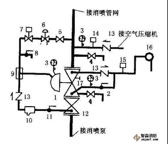 注:1、主閥體 2、報(bào)警測(cè)試閥 3、壓力表 4、排水閥 5、重置閥 6、 PORV壓力控制導(dǎo)閥 7、電磁閥 8、緊急啟動(dòng)閥 9、加速器 10、過濾器 11、球閥 12、水源控制閥 13、止回閥 14、低氣壓監(jiān)測(cè)開關(guān) 15、高壓水流報(bào)警開關(guān) 16、水力警鈴 17、積水測(cè)試器