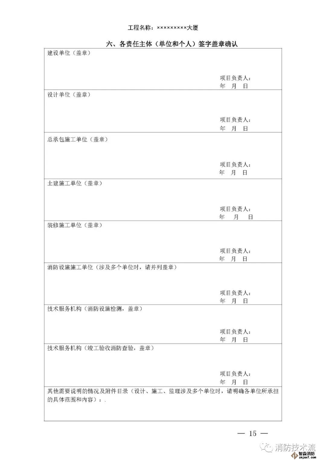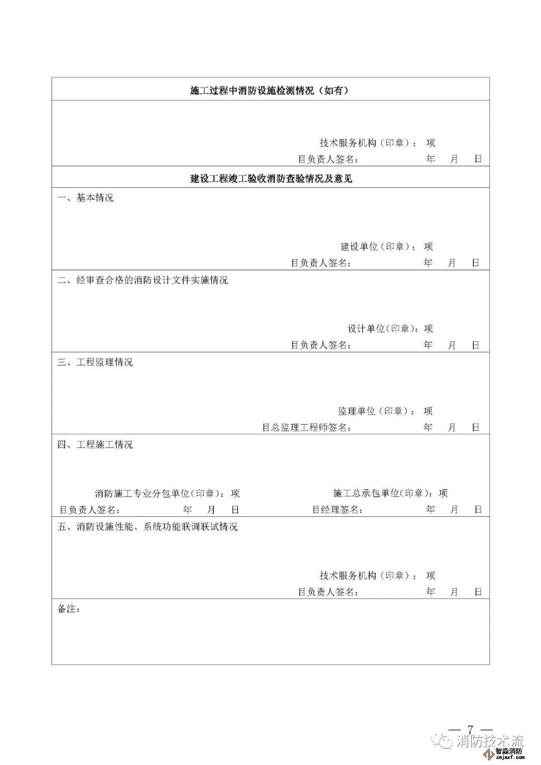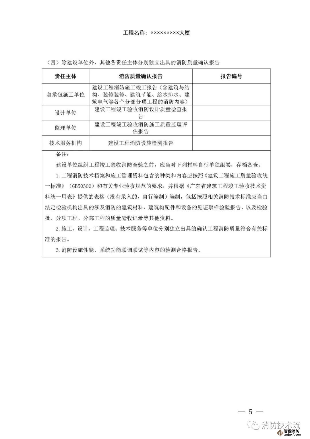 其中附件2和附件5中的填表說明均表示: 建設(shè)單位如未直接和符合從業(yè)條件的技術(shù)服務(wù)機(jī)構(gòu)訂立委托合同,在施工過程中自行完成消防設(shè)施檢測(cè),或在建設(shè)工程竣工驗(yàn)收消防查驗(yàn)時(shí)自行完成中 消防設(shè)施性能、系統(tǒng)功能聯(lián)調(diào)聯(lián)試,則本報(bào)告中 “ 技術(shù)服務(wù)機(jī)構(gòu) ” 一欄由建設(shè)單位及其項(xiàng)目負(fù)責(zé)人蓋章、簽字,并承擔(dān)相應(yīng)責(zé)任和法律后果。