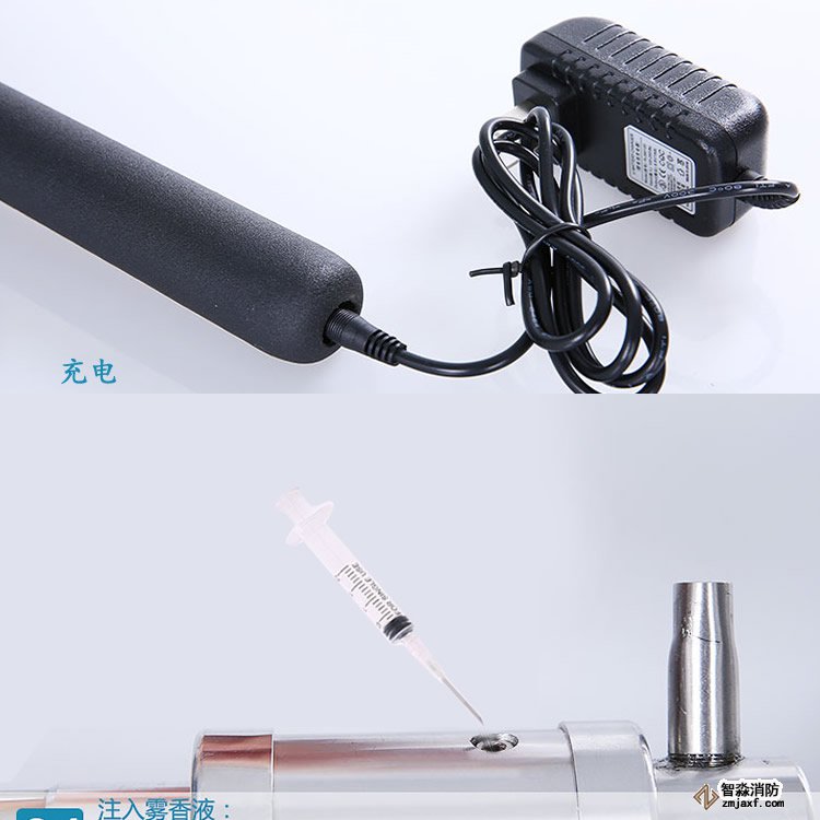 本產品采用電子感應裝置,無需手動開關,使用時打開檔位開關,距離煙感5CM時自動啟動,方便快捷,加煙器采用特制的霧香液電子霧化技術,發出的煙霧有各種香味且綠色環保,無毒無害。根據火災探測器倒掛在頂棚上的狀況,為避免加煙后煙霧長時間滯留在火災探測器迷宮內,特制霧香液霧化成煙后的比重大于空氣比重,加煙試驗后短時間內能在迷宮內快速消失,有利于提高試驗工作效率。電子霧化發煙代替原有的傳統的棒香加煙方式,不僅加煙方式有了進一步的升華而且煙霧中不含煙塵煙油,可避免棒香加煙所產生的煙塵煙油對火災探測器造成二次污染。同時由于該產品采用了內部霧香液循環技術,降低霧香液的自然損耗,延長了霧香液使用時間,耗材使用成本隨之減少。